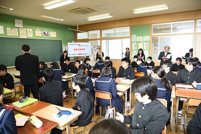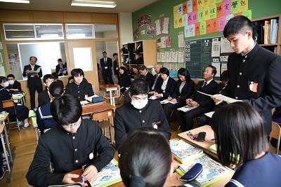 本日来校されたお客様の中には、「通勤で普段から佐織中の子とすれ違いますが、挨拶をすると会釈をしてくれたり、信号待ちで気遣いをしてくれたりして、とても気持ちがいいですよ」と、私たちの知らない子どもたちの様子を教えていただけるなど、今日の学校生活だけではない、地域で生活する様々な子どもたちの実態までも情報交換がされました。さらに、今日の2・3時間目には、全てのクラスの授業の様子をお客様に参観していただきましたが、どのクラスも雰囲気がとても温かくて和やかなことに好感をもっていただくことができました。その後の4時間目には、3年B組にお客様と佐織中のほぼ全員の先生が集まり、授業参観がありました。この授業を通じて、午後には先生たちが「研究協議会」を行い、よりよい授業づくりについてみんなで研修を深める機会をもちました。
