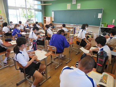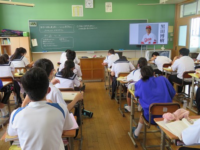 5時間目には2年生が、プロ野球やメジャーリーグで活躍した黒田投手を題材にして、「希望と勇気、克己と強い意志」について考えました。