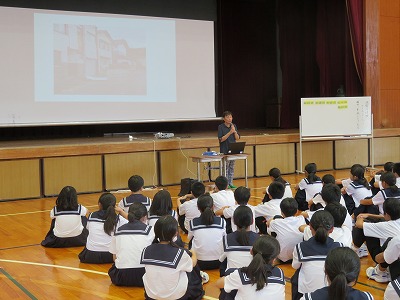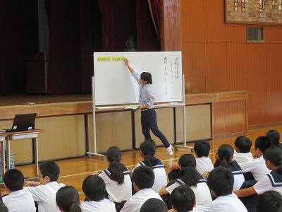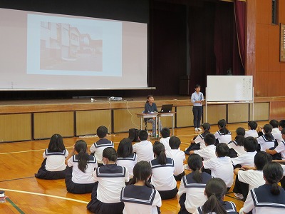 今日の6時間目には、1年生が体育館で「避難所体験オリエンテーション」を行いました。10月8日(火)に行う避難所体験に向けて、講師の東嶋先生をお迎えして、訓練内容はもとより、災害発生時を想定した心構えなどについてもお話をしていただきました。