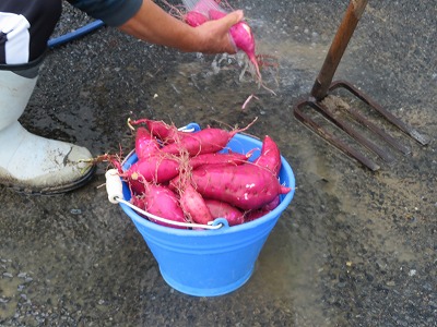 最初は茎をもって引っ張り「発掘」していましたが、全部抜き終わったところで、「あ!土の中にまだあるよ!」と発見する子がいて、最後はみんなで「宝探し大会」になりました。埋もれていた芋を見つけた時の笑顔は本当にキラキラと輝いていて、子どもたちにとって貴重な体験となったようでした。見ている私たちにとっても、たくさんの笑顔が「収穫」でき、パワーをもらうことができました!