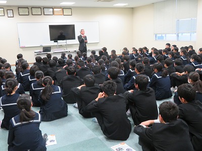 2年生全員が会議室に集まっていて、校長先生が子どもたちに「まずは、どこに行けるかではなく、どこに行きたいかを考えることが大切」というお話をされていました。