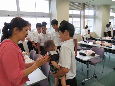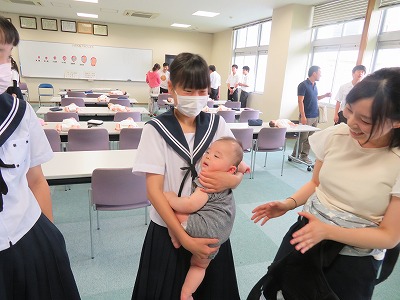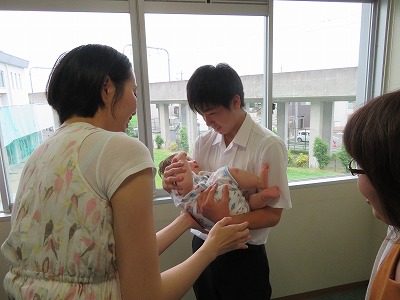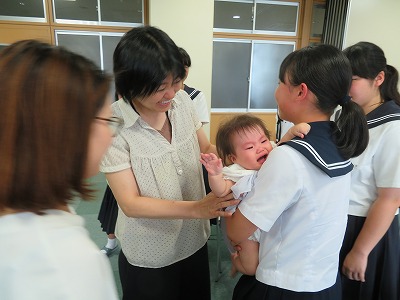 その後、赤ちゃん人形を使って抱き方を知ったところで、いよいよドキドキの実際の赤ちゃんを抱っこしてもらいました。「怖いー」「かわいいー」いろいろな声が響き渡る体験になりましたが、それぞれに命の尊さ、親の思い、自分の成長などを考える貴重な時間を過ごしました。