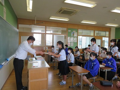 なるべく全校での集会を避けるということで、本来であれば全校生徒の前で「認証式」を行いたいことですが、やむなくこういった形となりました。形は変わっても、任された役割の重要さに変わりはありません。仲間たちのために、それぞれにしっかりと職責を果たしてほしいと思います。ちなみに、1・2年生は、明日・明後日にそれぞれ渡す予定です。