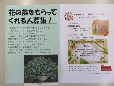 今日の帰りに、痰飲の先生を通じて子どもたちに「花の苗をもらってくれる人募集」というお知らせがありました。