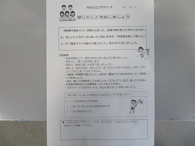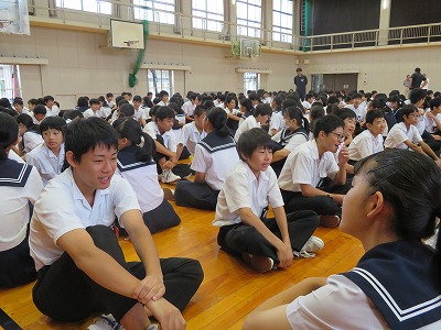 そこで今日の1時間目は、朝礼からの続きで「全校一斉アサトレ」を行い、学校祭や期末テストについて話をしました。ピシッと引き締まった朝礼の続きだったので、最初は顔を見合わせても、少し恥ずかしそうにしていましたが、時間とともに雰囲気もほぐれて笑顔で話す様子が見られるようになっていきました。