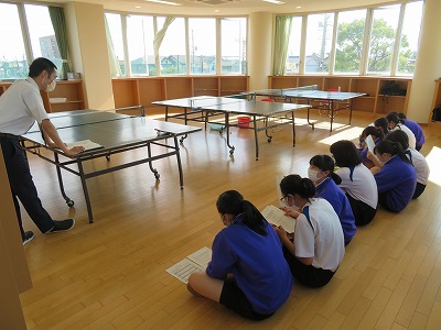 武道場・生徒会室・多目的室では、外で活動する部の子たちや吹奏楽部、卓球部がそれぞれに集まって、顧問の先生からの説明や話を聞きました。特に3年生は、教室では見られない真剣な表情になっていて、「やっぱり部活動は特別な場所だなー」と感じました。