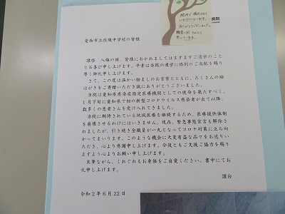 以前お伝えした「医療従事者の方々に、感謝と励ましの絵手紙を送ろう!」プロジェクトで、絵手紙を送付した医療機関から、以下のようなお礼状と院内掲示していただいた写真が送られてきました。