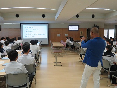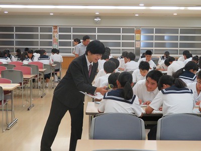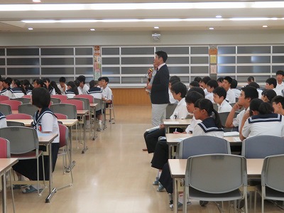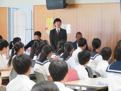 今日の午後には、10月下旬に職場体験学習を行う2年生のために、この地域で社会貢献活動に尽力されているタカイエンタープライズの方にお越しいただき、出前授業をしていただきました。情熱溢れる今日のアツイお話から、子どもたちが働くことの中にある喜びや、働く人たちの意識・思いを学び、実り多い職場体験学習の3日間を過ごす準備をしてくれたら、と思います。