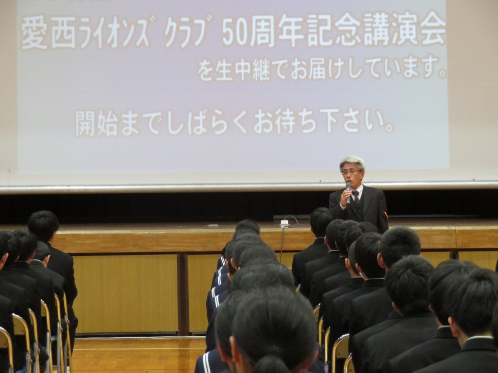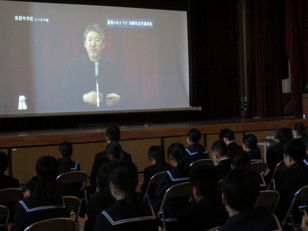愛西ライオンズ50周年の記念事業として、人権に関する講演会が行われました。この講演は、市内の全中学校に「ライブ生配信」という初めての試みで行われました。生徒達は佐屋中学校で行われている講演を、本校の体育館で「ライブ中継」として聴きました。講演の内容で印象的だったのが「(その人に)できないことは頼まれない」ということ「頼まれ事は試され事」として考えてみることでした。