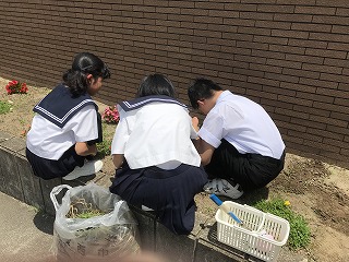 さおり組は、5月に玄関の花を植えました。だんだん株が大きくなり、きれいな花を咲かせています。それと共に雑草たちも成長しつつあるので、今日は草取りをしました。