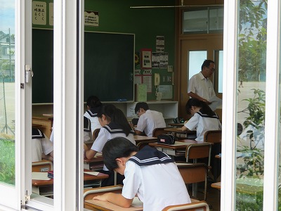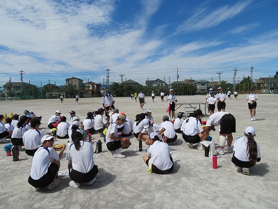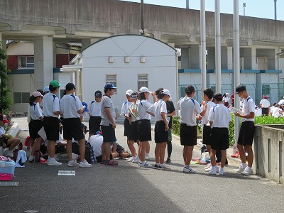 しかし、学校祭に向けた準備も必要なので、1・2時間目は活動場所や内容に注意しながらブロック練習、3時間目には体育祭に向けて確認が必要な係の生徒だけを集めて、器具の準備や式の進行などの練習を行いました。外に出た係の子たちは帽子着用の上、なるべく日陰で待機しながらそれぞれ活動する一方、それ以外の生徒は教室で自主学習に集中して取り組みました。