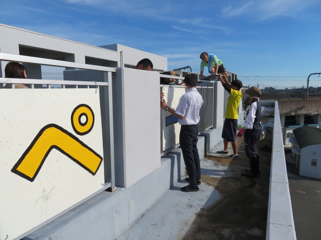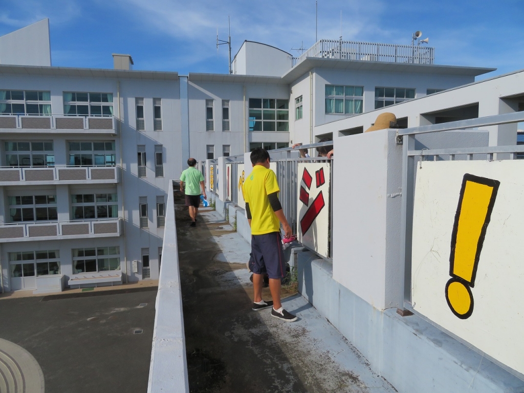 心配された台風の影響もなく、代わりにその台風がつれてきた「残暑」の厳しい日となりました。その台風のために、外されていた今年の学校祭テーマのパネルが、先生たちの手によって、「復活」しました。今週は学校祭に向けてのスパートとなる週です。