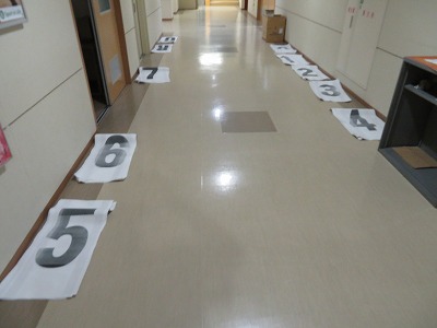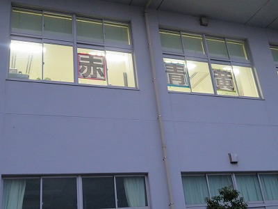 生徒が下校した校舎の窓には、「赤」「青」「黄」の文字が掲示されました。職員室前の廊下には、たくさんの数字のカードが並べられていました。これらは、明日の体育祭総練習に向けて準備された物品です。