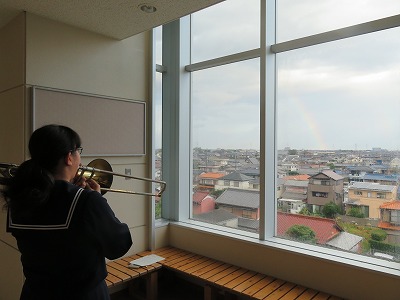 頑張る子どもたちを応援しているかのように、窓の向こうには美しい虹が出ていました。また今日から、気持ちをひとつにして勉強に、部活動に、みんなで頑張りましょう!