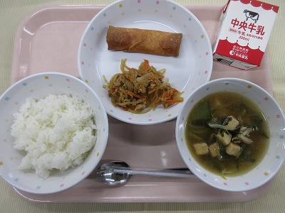 ご飯、牛乳、愛知の野菜入り春巻き、チャプチェ、中華スープ