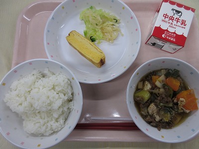 ご飯、牛乳、厚焼き卵、すき焼き風煮、即席漬け