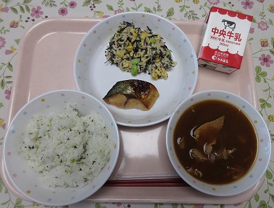 菜飯、牛乳、さばのしょうゆ麹焼き、ひじきとマカロニのマヨネーズ和え、切り干し大根入り豚汁