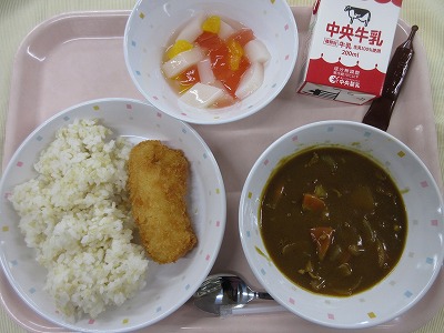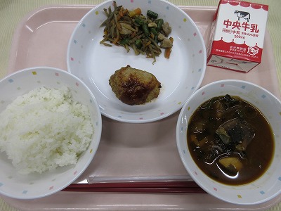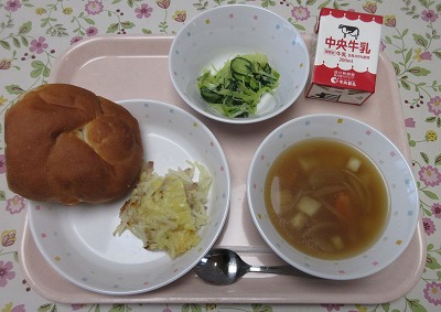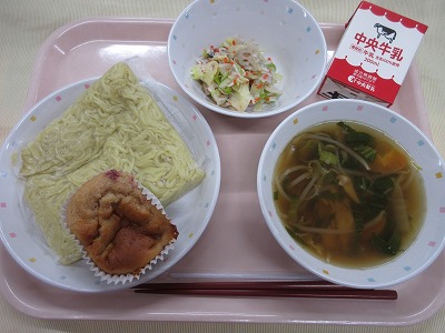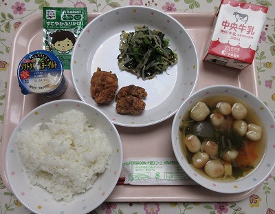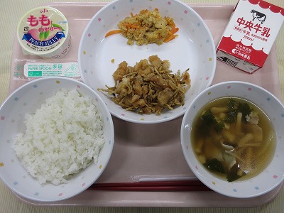 ご飯、牛乳、ビビンバ(肉炒め、ナムル)、トックと卵のスープ、清見オレンジ 旬の果物の清見オレンジが登場です。清見オレンジは、みかんとオレンジをかけ合わせて日本で誕生したものです。みかんの甘さとオレンジのさわやかな香りが特徴で、人気の果物です。清見オレンジや、はっさく、いよかん、不知火などがおいしい季節ですが、柑橘類には、クエン酸が多く含まれ疲労回復効果が抜群です。また、柑橘類の香りには、高いリラックス効果も期待できることから、心も体も元気にしてくれるパワーがあります。季節の変わり目でストレスが溜まりやすい時期でもあるので、柑橘類でパワーアップ!