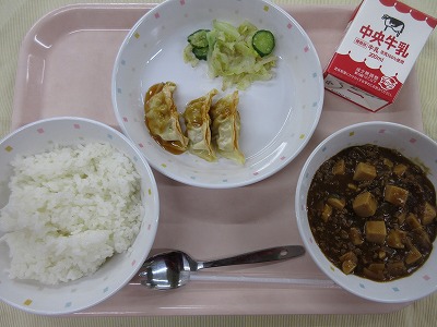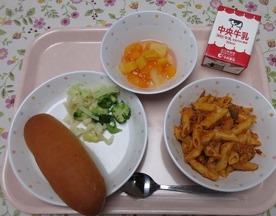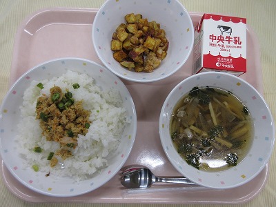 ご飯、牛乳、白身魚のヤンニョム風味、チャプチェ、キムチスープ 白身魚のヤンニョム風味は、コチュジャン、ケチャップ、しょうゆ、砂糖、ごま油、にんにくでたれを作り、片栗粉をまぶして油で揚げた白身魚と絡めました。コチュジャンは、辛みと甘味のある味噌です。ビビンバやヤンニョムチキン、タッカルビなどでよく使われています。生野菜につけて食べたりもしますが、今日は、ケチャップや砂糖を混ぜて、あまり辛くならないようにして作っています。甘辛い味でご飯もすすみます。