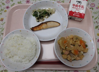 赤飯(ごま塩)、牛乳、さわらの天ぷら、金平ごぼう、春のすまし汁、お祝いゼリー 4月10日の給食メニューはお祝い献立で、赤飯や縁起のよい出世魚としても知られる鰆を使った天ぷら、お祝いゼリーなどがありました。赤飯は、栄養的にもおすすめで、腸内環境を整えるのに欠かせない食物繊維が、白飯の2倍以上含まれています。もち米が半分混ぜてあるので、もちもちした食感も楽しめます。