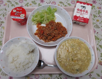 タコライス(ご飯、具、ゆでキャベツ)、牛乳、コーンエッグスープ、りんごゼリー