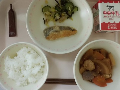 ゆかりごはん 牛乳 さわらのマヨネーズ焼き 切り干し大根の炒め煮 お餅入り野菜汁
