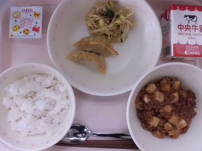 麦ごはん 牛乳 ぎょうざ マーボー豆腐 大豆もやしのかみかみ和え