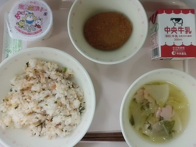 ごはん 牛乳 鮭ちらしごはん コロッケ 梅のすまし汁