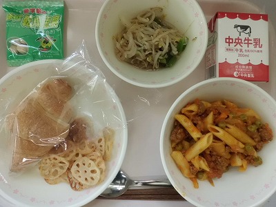 クロワッサン 牛乳 ペンネマカロニのミートソース れんこんチップス