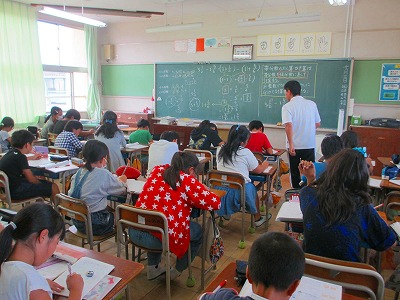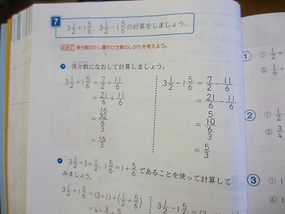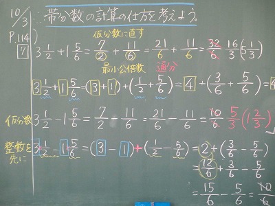 5年生が帯分数の計算の仕方を学んでいました。帯分数を仮分数に直し、最小公倍数で通分して答えを求める方法と、帯分数の整数どうしと分数どうしを分けて答え求める2通りの解き方を理解し、何問かの計算問題に取り組んでいました。