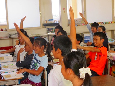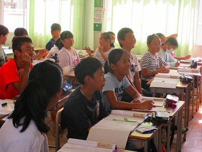 5年生が算数で「人文字」の学習をしていました。たとえば「1m間隔で人文字を作ります。全部で何人ですか」という問題で、図をかいてみれば分かると思いますが、直線であれば全体の長さ÷間隔+1が並べられる数です。みんなは、文字をいろいろと考えているうちにとても楽しい発見をしたようで笑顔いっぱいでした。