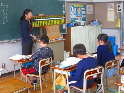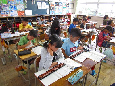 4年生が算数でそろばんを使って、計算をする学習に入りました。大きな数と少数の読み方・入れ方(置き方)ができるようになることや、玉の正しい入れ方(一玉を入れる時は親指、それ以外は全て人差し指)ができることが目標です。みんな真剣です。