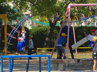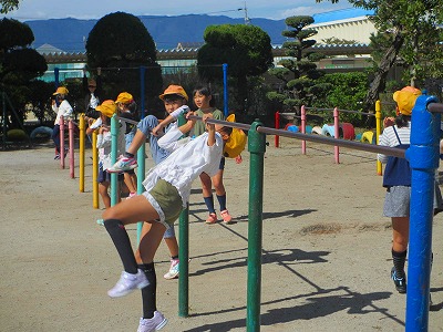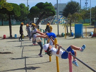 運動場での子どもたちの動きがより活発になってきました。体育の授業で鉄棒に取り組んでいるので、いつも以上に鉄棒で遊んでいる子が多くいました。
