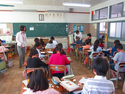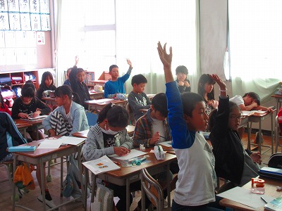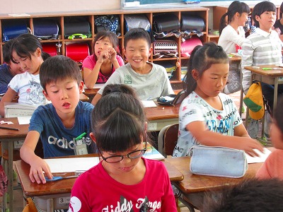 4年生が算数で三角形と正方形の色紙をハサミで切ってパズルにして広さ比べをしていました。実際にパズルにして組み合わせていくと、目で見るのと違って結果になっているようでした。操作して確認することの大切さが分かりました。