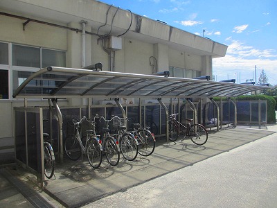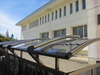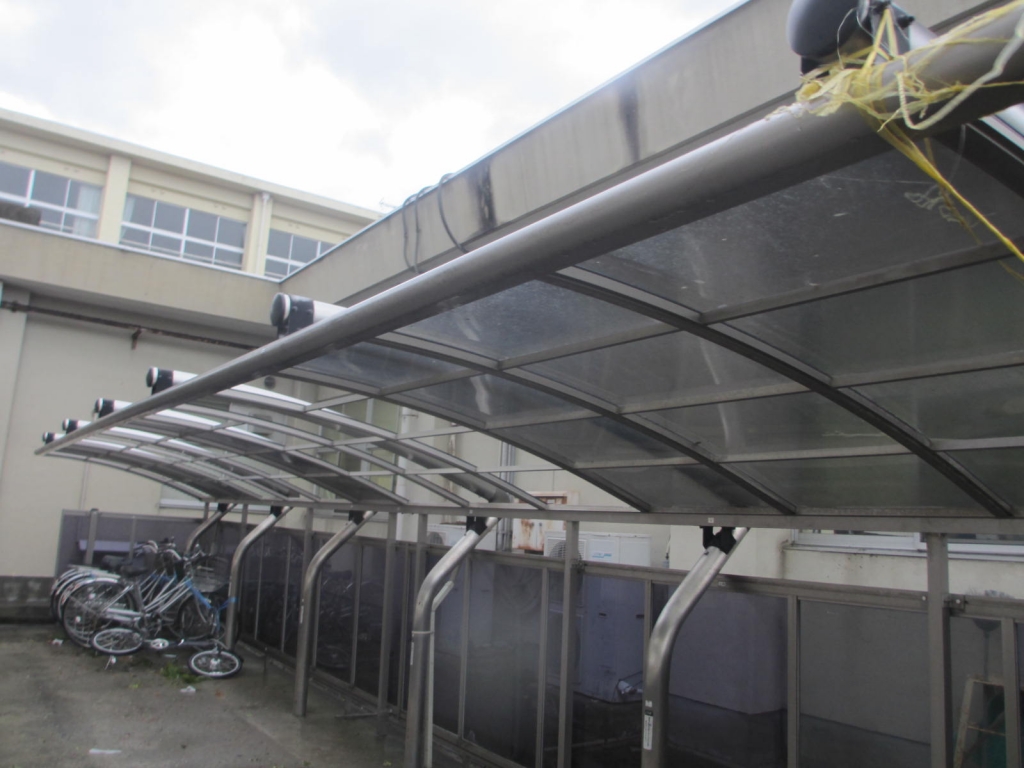 9月4日の台風21号の被害でサイクルポートの屋根が中央の写真のように破損しましたが、部品が届き本日無事に修復されました。