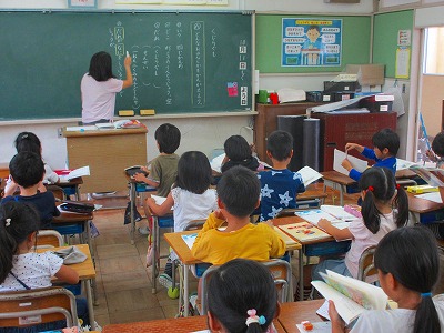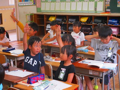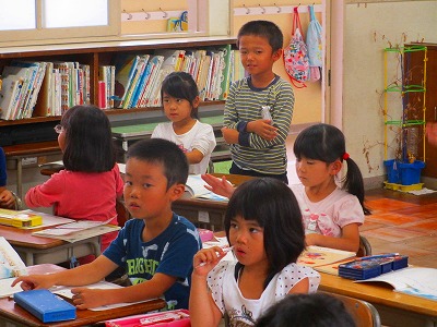 1年生が「くじらぐも」を学んでいました。「いつ」「だれが」「なにをした」の問いに自分の考えをワークシートに書きまとめ、発表していました。友達の意見をよく聞くようにと、教師からの声がけがありました。「聞く」という学習活動の大切さを授業の中で学んでいました。