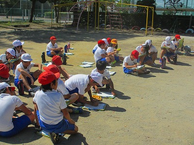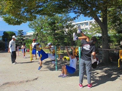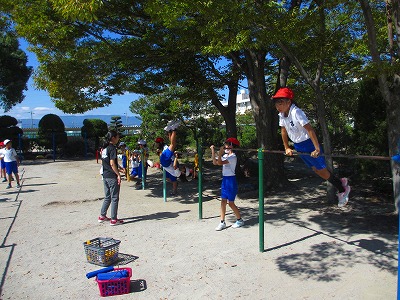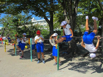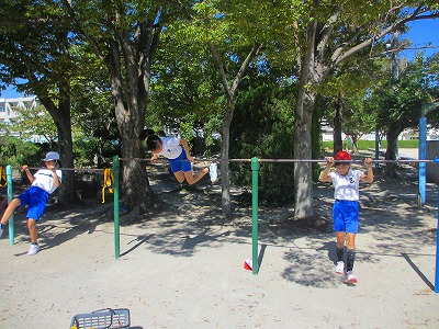 4年生が鉄棒運動に取り組んでいました。逆上がりから鉄棒上での腕立て後転をつなぐ練習でした。逆上がりに苦戦している子もいましたが、何回も繰り返してこつをつかもうとみんな必死に頑張っていました。