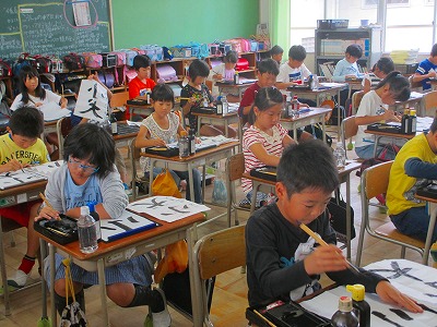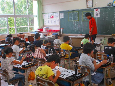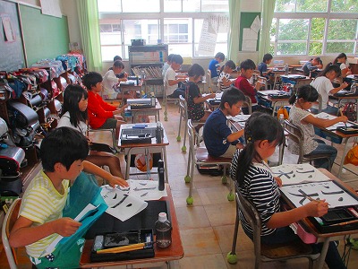 3年生が書写コンクールで書く「小犬」の練習をしていました。とめ、はらい、はねなどの基本の筆運びを力強く繰り返していました。