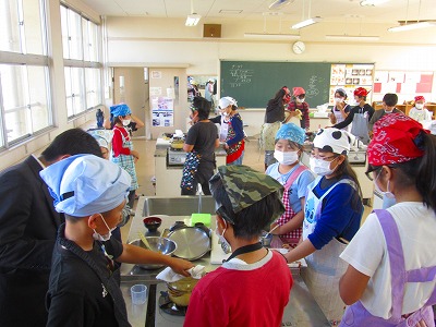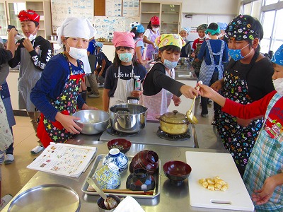 5年生が調理実習で「ごはんとみそ汁」を作っていました。事前の学習を生かしてガスを利用して加熱しました。みそ汁のだしの取り方、だいこんやねぎ、あげの切り方は班のみんなで確認し合って調理していました。