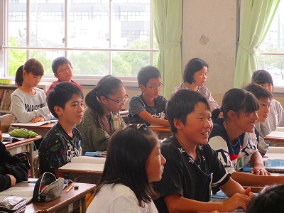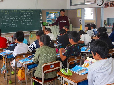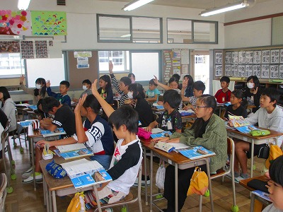 6年生がしま模様の地層がどのようにしてできたか、地層の中に含まれている化石や土質の違うものが重なっていることを手がかりに話し合っていました。