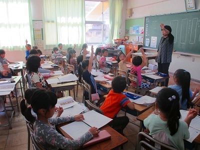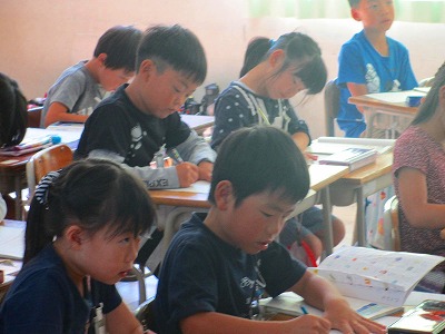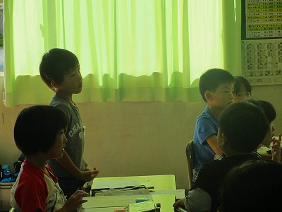 1年生が国語で初めての「説明文」の学習に挑戦していました。本文を読んでワークシートに「なにがどのように海の中でかくれているのか」をまとめていました。問いかけに対する答えを、意見の発表ではっきりさせていました。