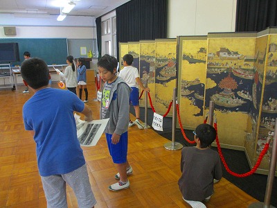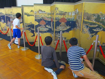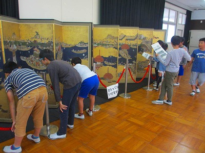 昼休みには、何人かの子がじっくり落ち着いて屏風に描かれた細かな人の表情や、祭を楽しんでいる様子見ようと集まっていました。見れば見るほど当時の暮らしぶりが分かってきました。