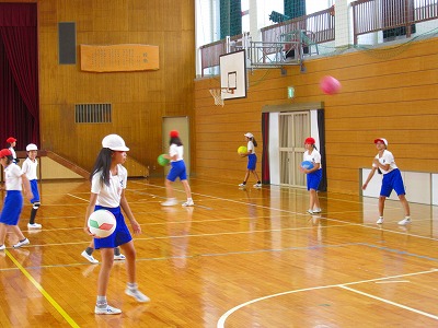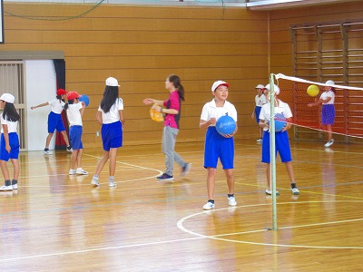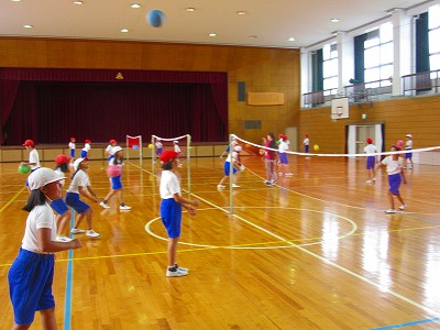 5年生がソフトバレーボールを使ってネット型のボールゲームを学んでいました。片手でアンダーハンドからボールに手をヒットさせることや、両手を使ったレシーブでどうボールを浮かせるかを集中的に練習していました。