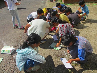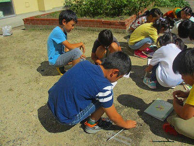3年生が理科の学習で温度計を使って日なたと日かげの地面の温度の違いについて調べていました。実験の結果から地面は日光によって温められていることを学びました。