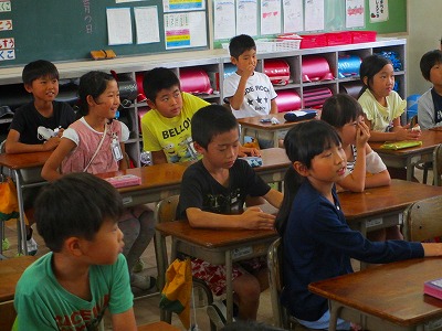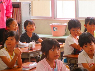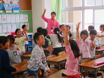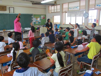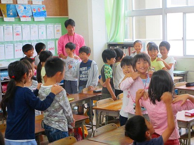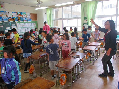2年生が「ロック シザーズ ペイパー(Rock Scissors Paper)」と言いながら、グーチョキパーを使って、ジャンケンゲームを楽しんでいました。負けた人は勝った人の後ろに回り、肩の上に手を置いて列車ができるゲームを楽しんでいました。