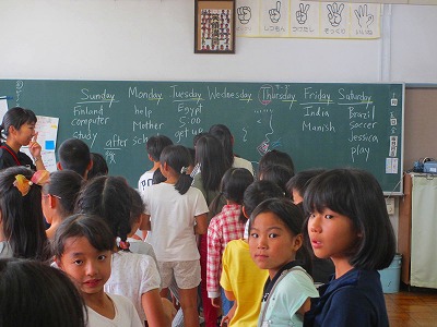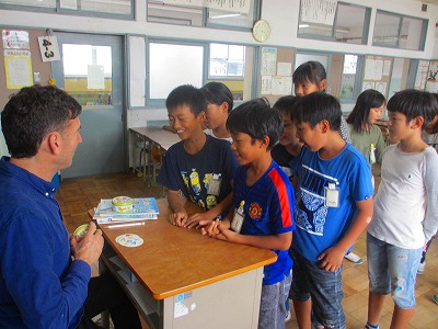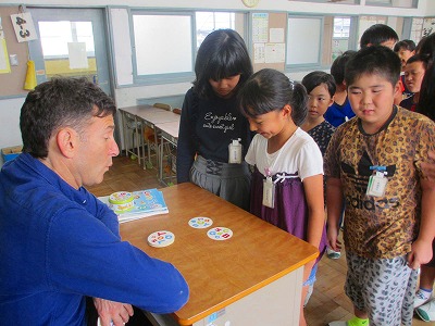 4年生が曜日や国の名前などの英語を学んだ後、マシューカードを楽しんでいました。丸いカードに色付きのアルファベットや簡単な図形がかいてあります。2枚のカードが出された瞬間に、2人のどちらが速く同じ色の同じアルファベットや図形を見付けるかを競いました。