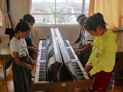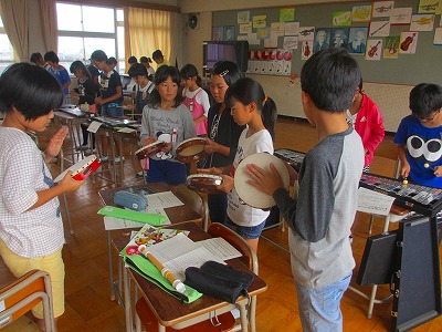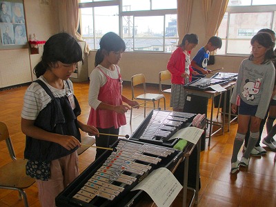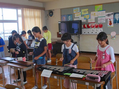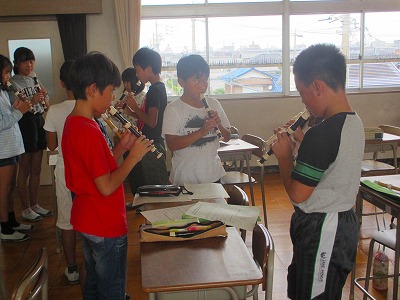 5年生が音楽でいろいろな楽器の音が重なり合うひびきを楽しみながら「リボンのおどり」を演奏しました。楽器はリコーダー、木琴、鉄琴、タンブリン、オルガンでした。みんなの息が合って、うまく合奏できていました。