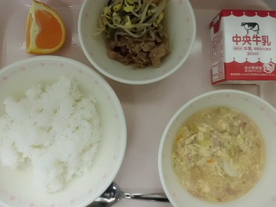 ごはん 牛乳 ビビンバ(肉炒め・ナムル) トックと玉子のスープ きよみオレンジ