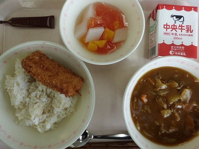 金芽ロウカット玄米ご飯 牛乳 カレーライス イカフライ 紅白お祝いゼリー