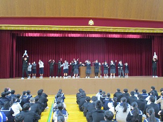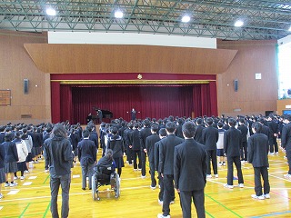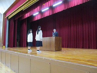 次に、校長先生から、大志式での3年生のすばらいし合唱についての話がありました。また、今日全校生徒で歌う最後の校歌、卒業式での最後の校歌をすばらしいものにしてほしいとのお話がありました。